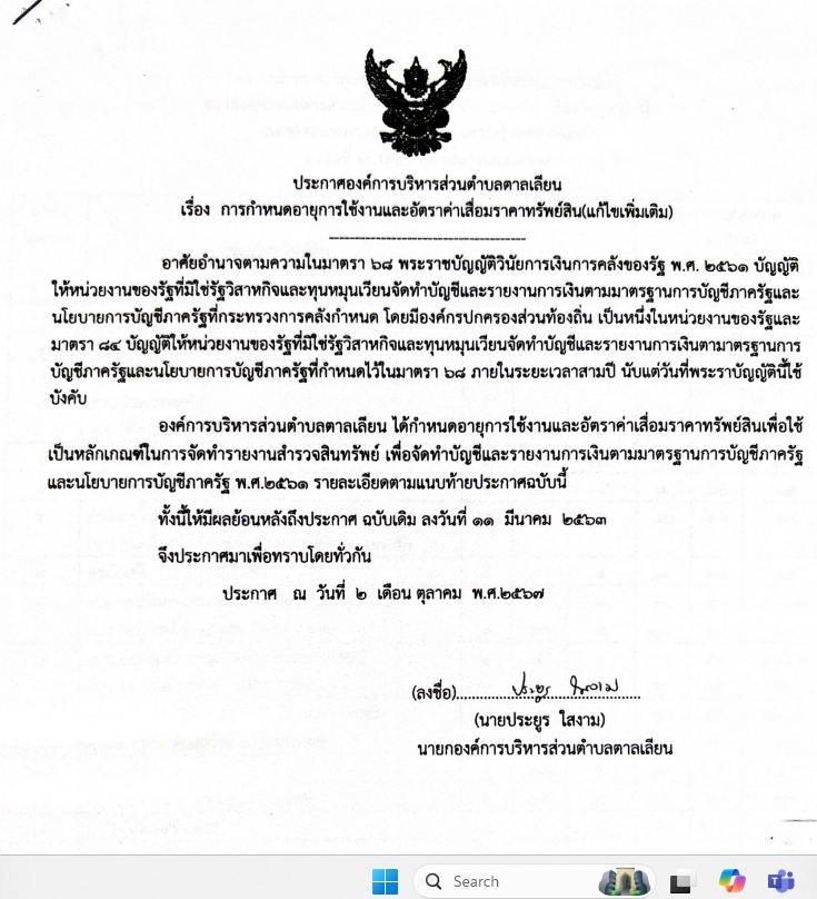 ประกาศ เรื่อง การกำหนดอายุการใช้งานและอัตราค่าเสื่อมราคาทรัพย์สิน (แก้ไขเพิ่มเติม) ประกาศองค์การบริหารส่วนตำบลตาลเลียน เรื่อง การกำหนดอายุการใช้งานและอัตราค่าเสื่อมราคาทรัพย์สิน (แก้ไขเพิ่มเติม) ประกาศ ณ วันที่ 2 เดือนตุลาคม พ.ศ.2567